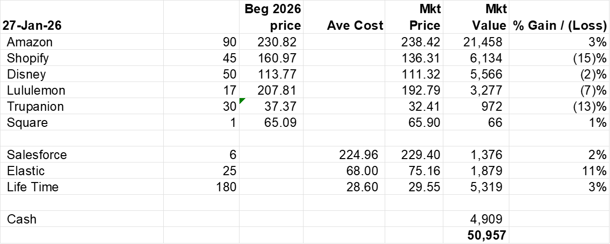 With additional purchases in Life Time LTH 0.00%↑ and Salesforce CRM 0.00%↑ completed in January, along with the Elastic ESTC 0.00%↑position, capital deployment for Q1 2026 is complete.