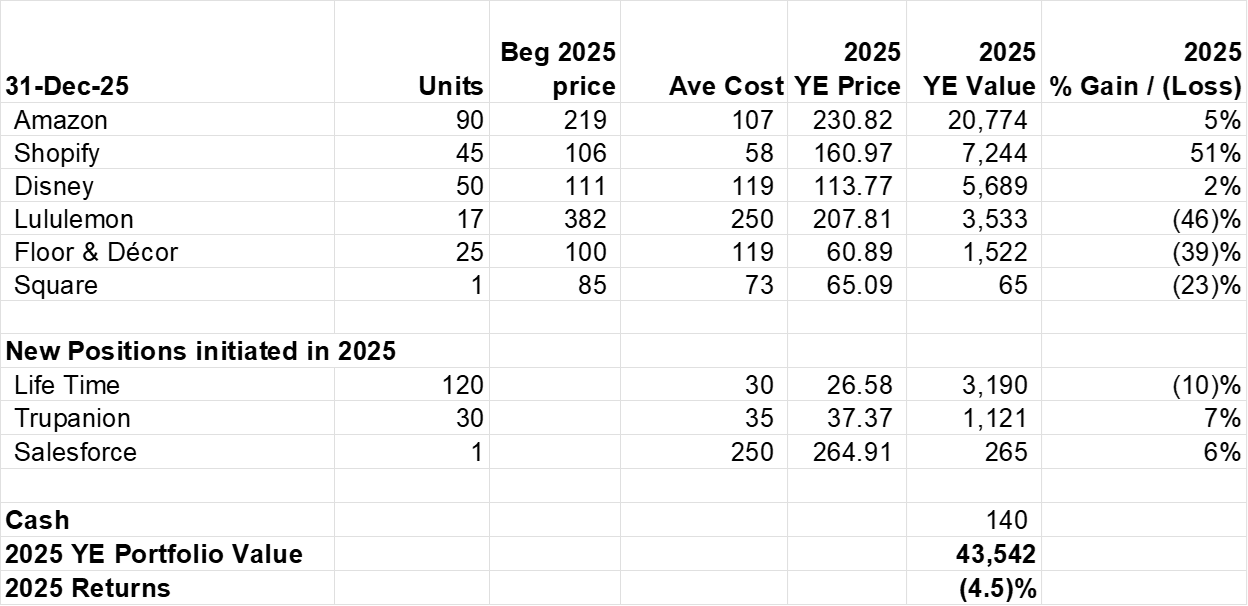 The primary contributors to underperformance were a lack of meaningful appreciation in Amazon AMZN 0.00%↑, which rose just 5%, and a significant drawdown in Lululemon LULU 0.00%↑ over the course of 2025. Neither position was actively traded during the year; performance reflected market movements.